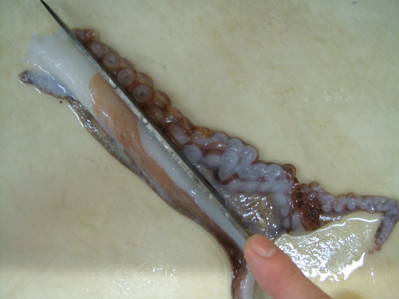 皮と吸盤は、茹でます。剥いた身(白)はさっと湯引きして薄造り。