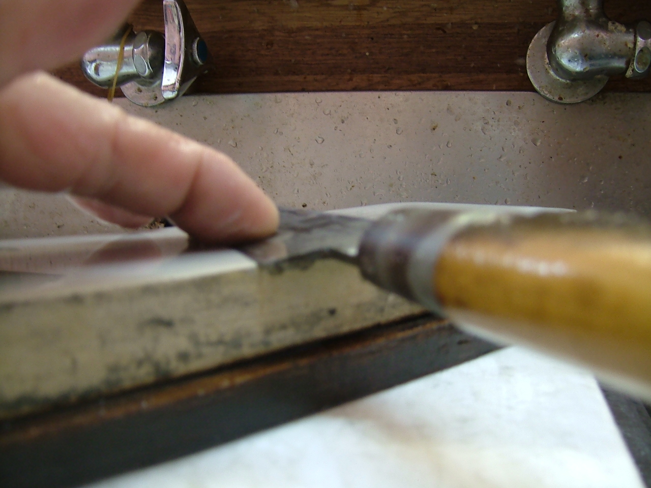 砥石にぴったり包丁の刃の面をつけて前後させて研ぎます
